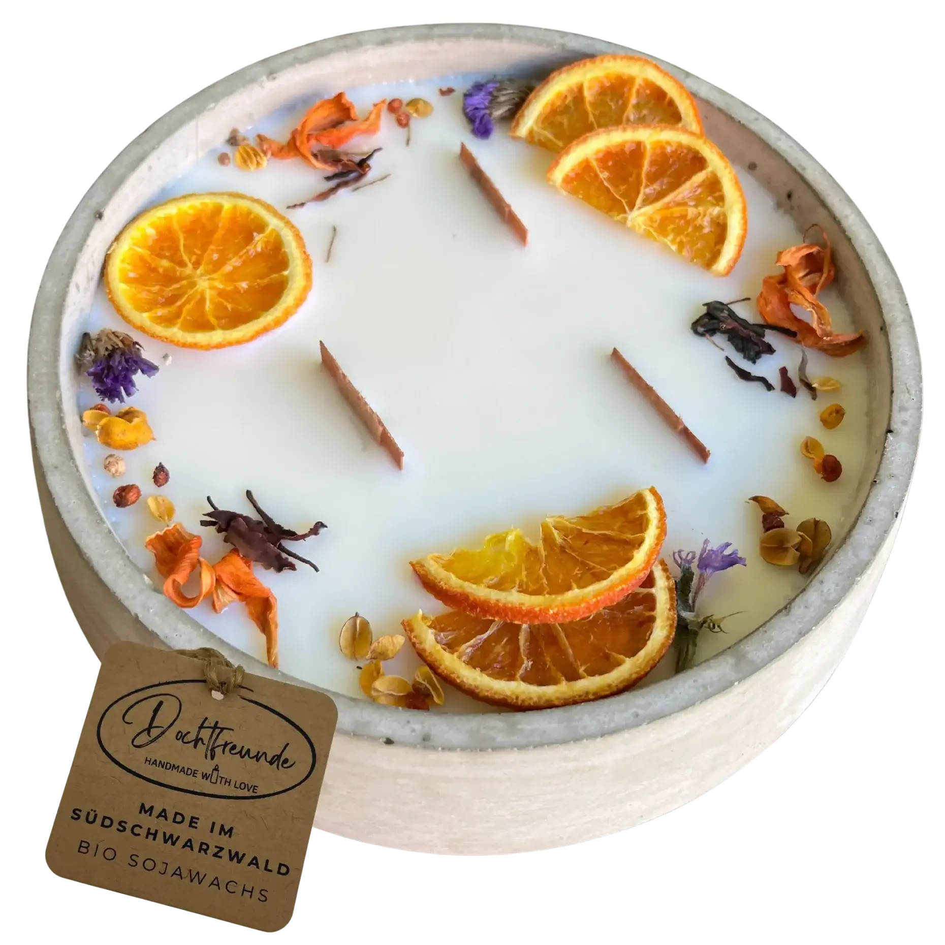 • Material: Veganes Sojawachs, versiegelter Beton, Holzdocht, getrocknete Blüten.