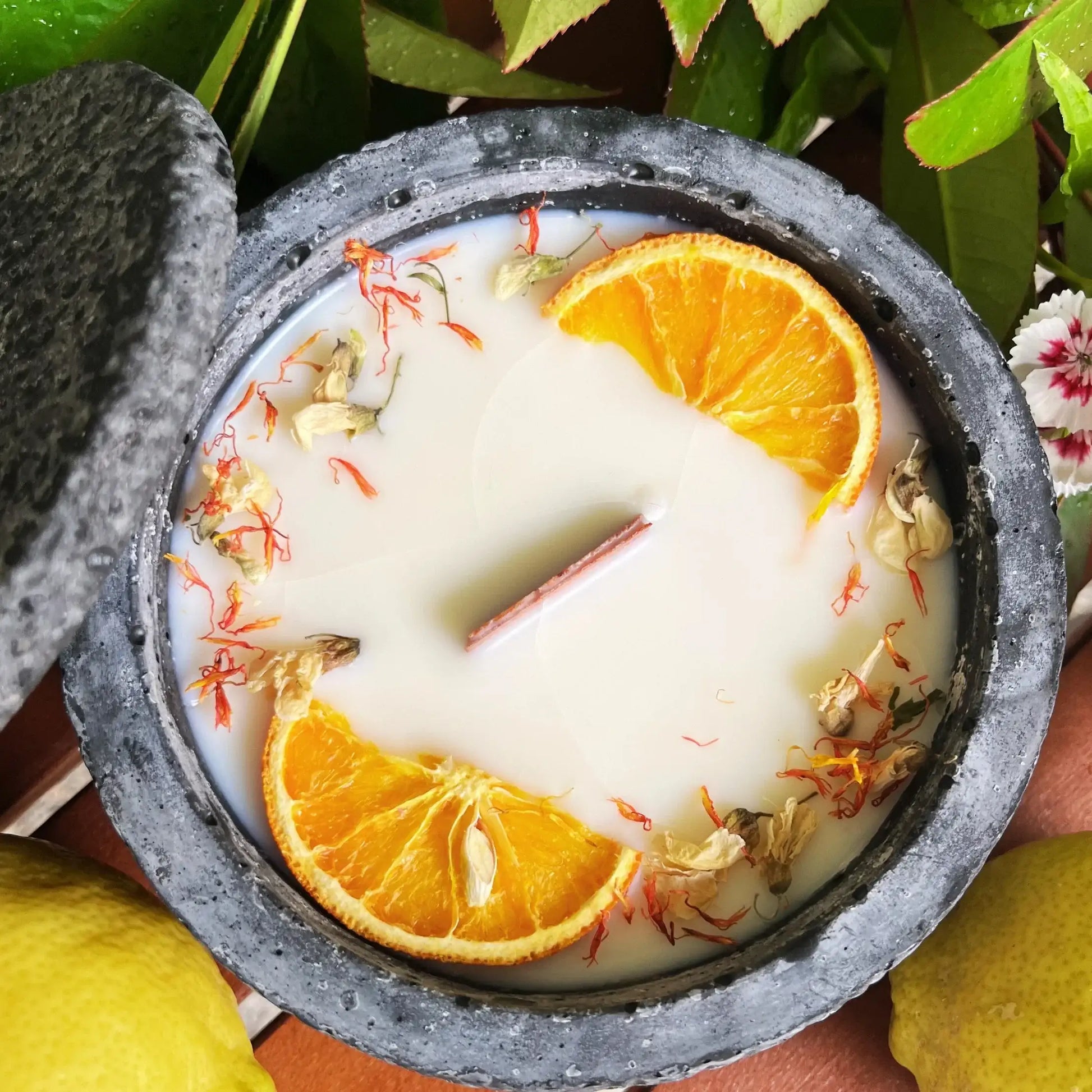· Material: Veganes Sojawachs, versiegelter Beton, Holzdocht, getrocknete Blüten