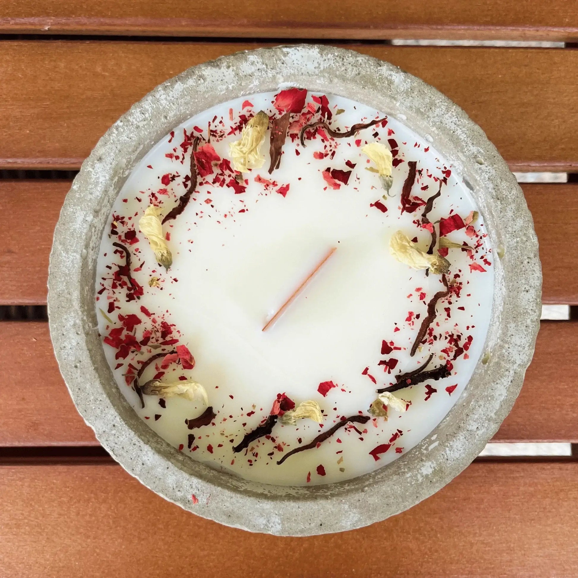 - Material: Veganes Sojawachs, versiegelter Beton, Holzdocht, getrocknete Blüten.