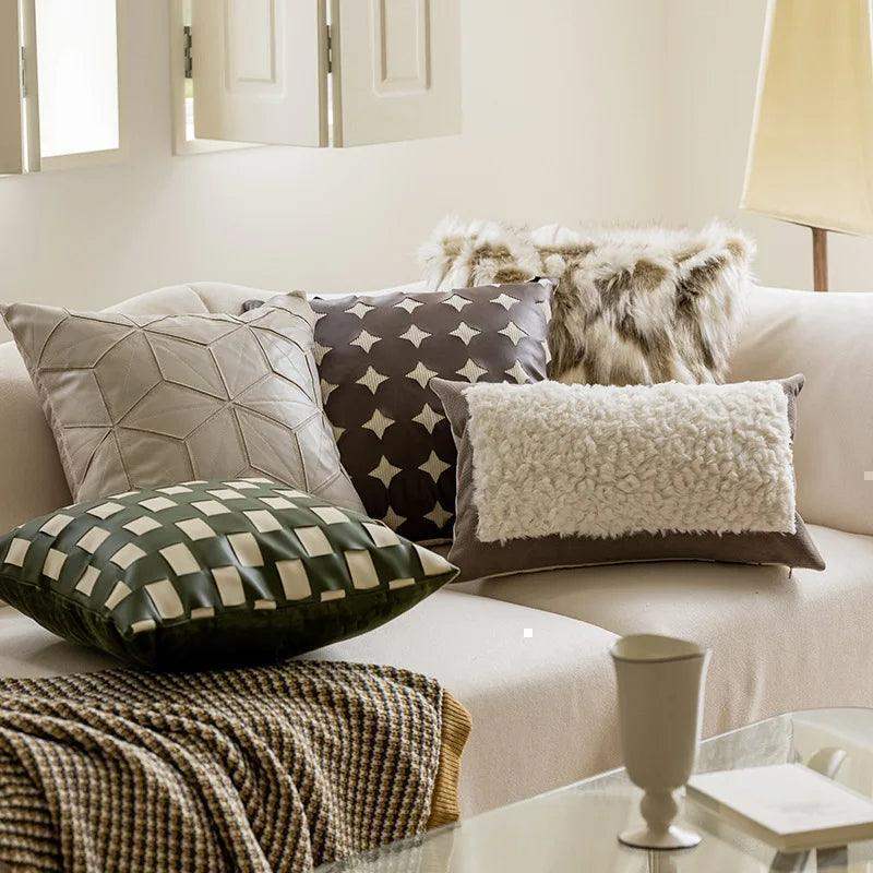 Housse de coussin de luxe nordique marron vert │ Housse de coussin décorative en fourrure à motif géométrique moderne