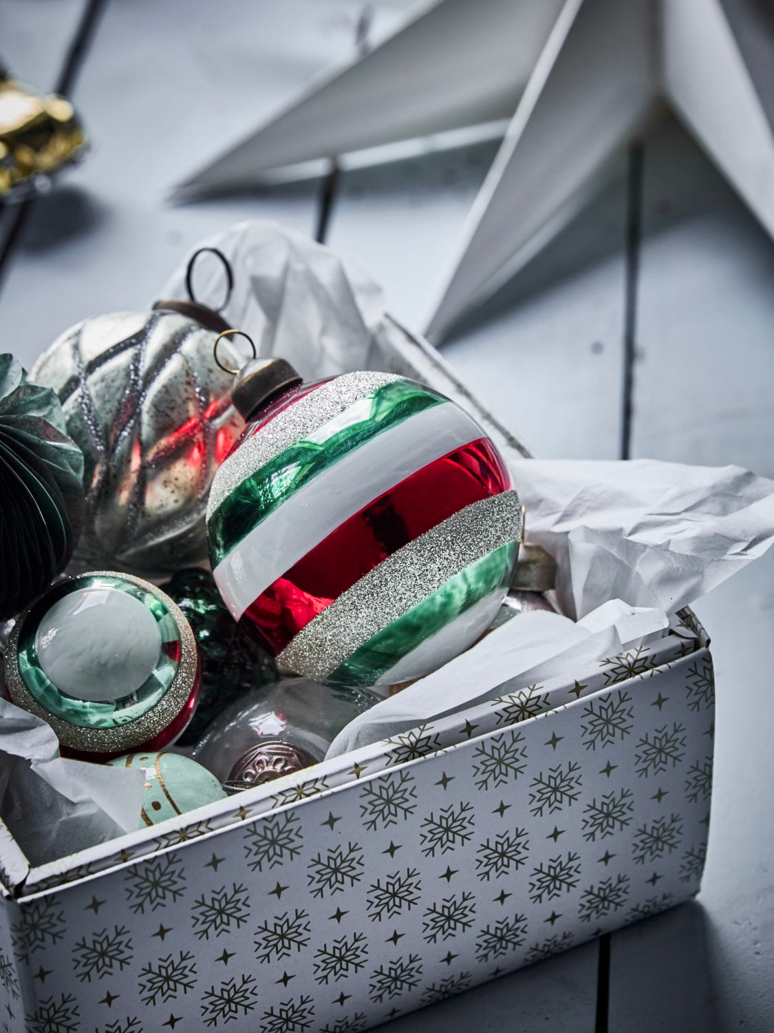 Bringe festlichen Glanz in dein Zuhause mit diesem Set aus vier mundgeblasenen Glasornamenten. Mit handbemalten Streifen in klassischen Weihnachtsfarben und einem Hauch von Champagnerglitzer strahlen sie Gemütlichkeit und Eleganz aus.